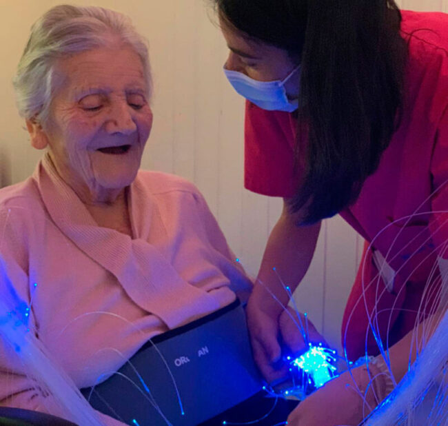 Perquè les persones grans poden treballar la memòria, la comunicació i fins i tot la coordinació psicomotriu, a les sales multisensorials Snoezelen es recreen atmosferes mitjançant l’ús de llums, aromes, música, sons i textures.