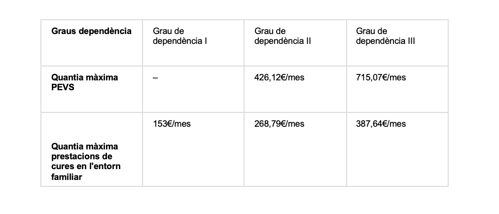 Totes dues prestacions estan subjectes al grau de dependència i a la capacitat econòmica del beneficiari, sent les quanties màximes les següents: