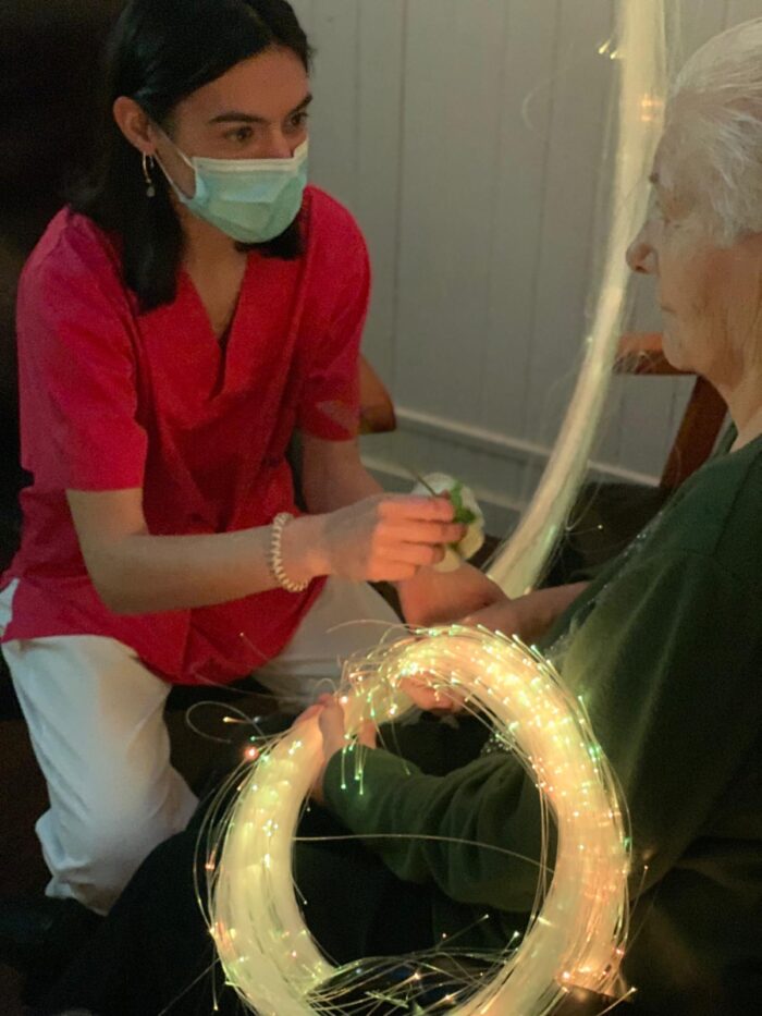 Para que las personas mayores pueden trabajar la memoria, la comunicación e incluso la coordinación psicomotriz, en las salas multisensoriales Snoezelen se recrean atmósferas mediante el uso de luces, aromas, música, sonidos y texturas.